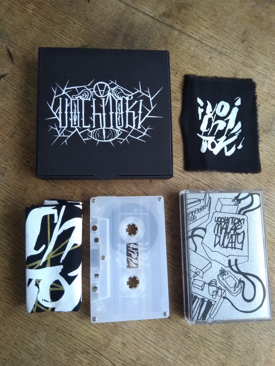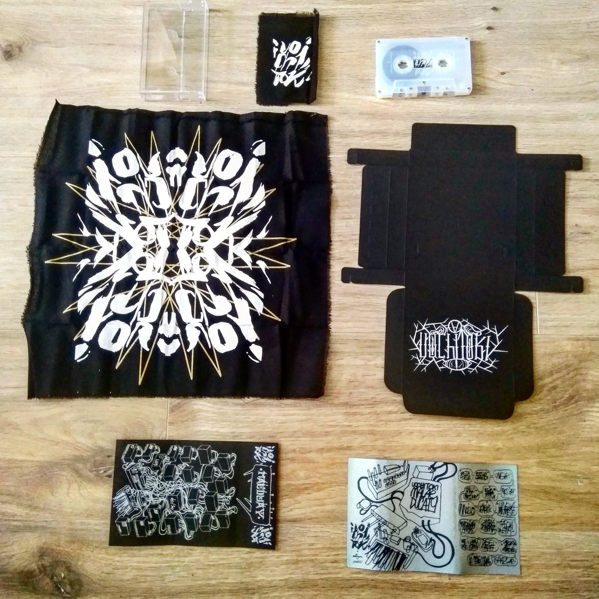 _ a black cardboard box silk screened by me with the "grindcore logo" drawn by Napo.